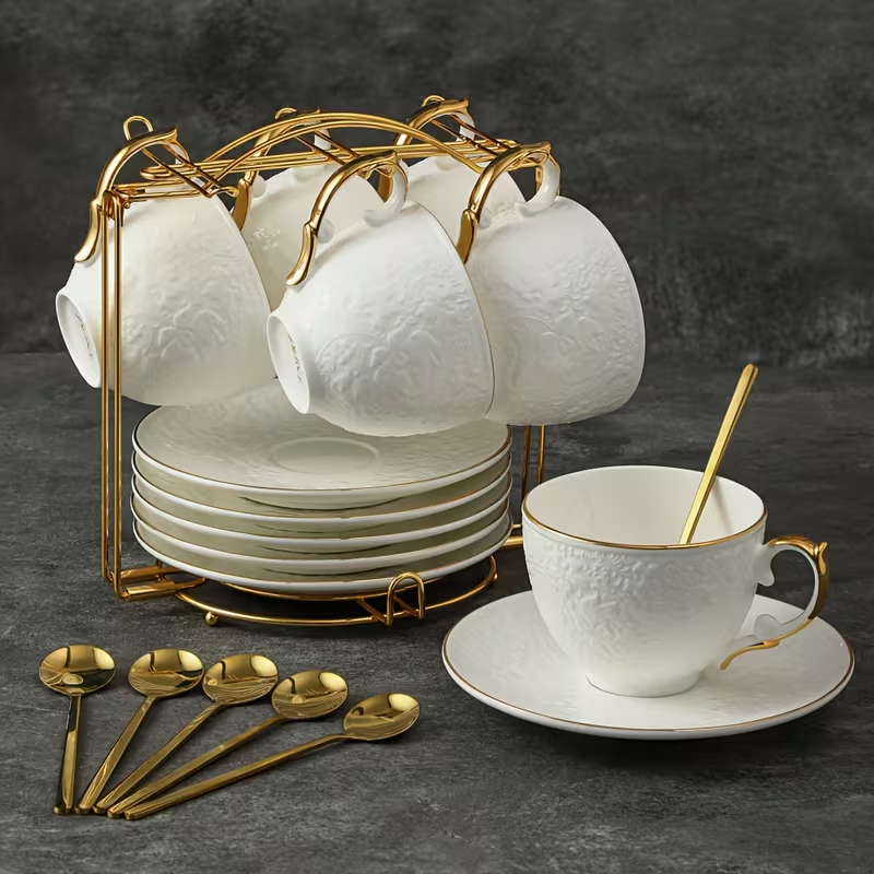 Core Packset is suitable for regular beverage serving in spacious kitchens or guest areas. Four complete sets provide a consistent and neat table arrangement. Bone china combines light weight with a smooth, pleasant surface. The included holders support organized storage and easy access during serving.
